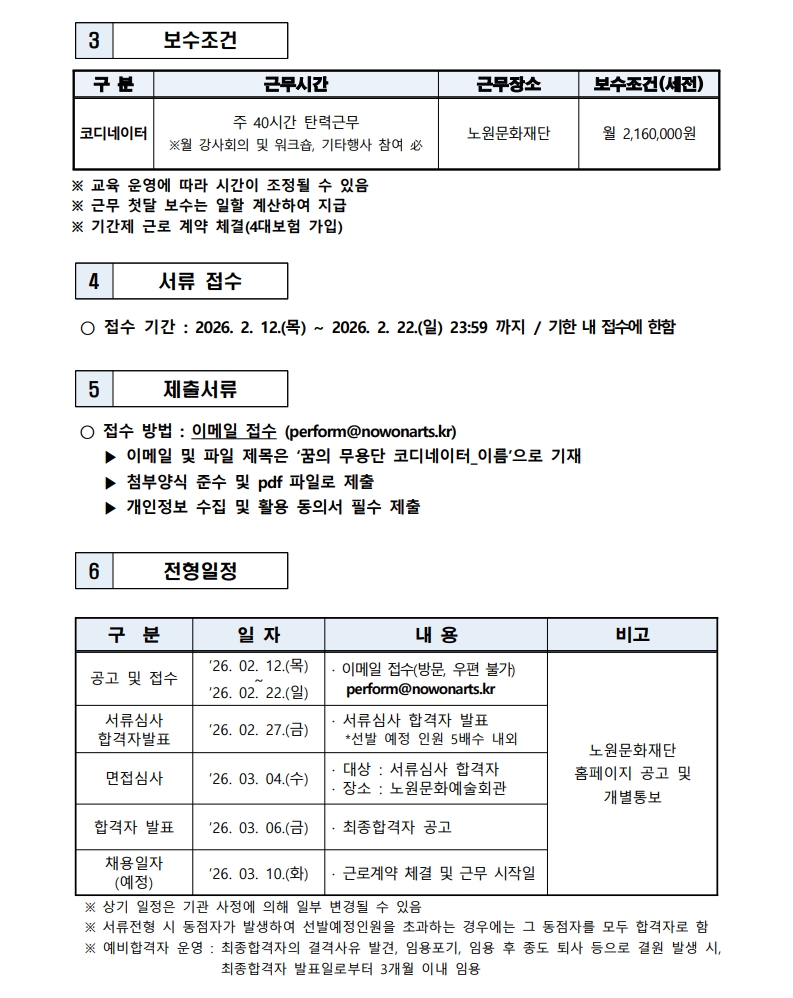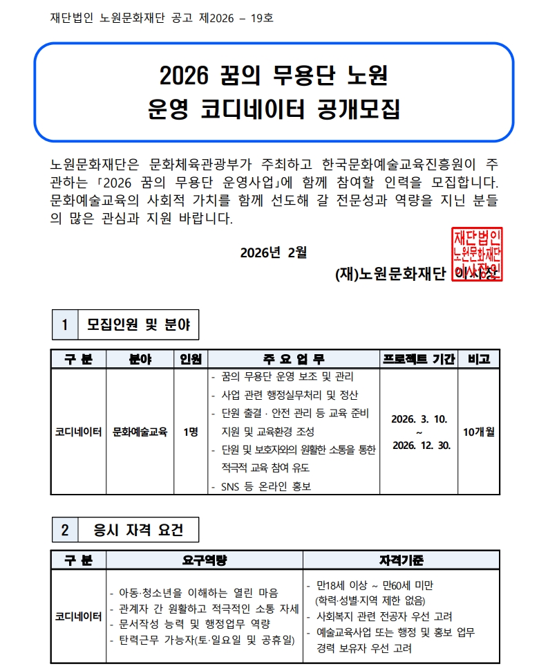 채용공고 2026 꿈의 무용단 노원 운영 코디네이터 모집 2026.02.11 37 현재 URL 복사 블로그 바로가기 첨부파일 #1: [지원양식] 2026 꿈의 무용단 코디네이터_응시자 성명.hwp 첨부파일 #2: 모집 공고문.pdf 다음글 2026년 2차 노원문화재단 노원구립도서관 채용 공고[대체계약직-사서] 목록