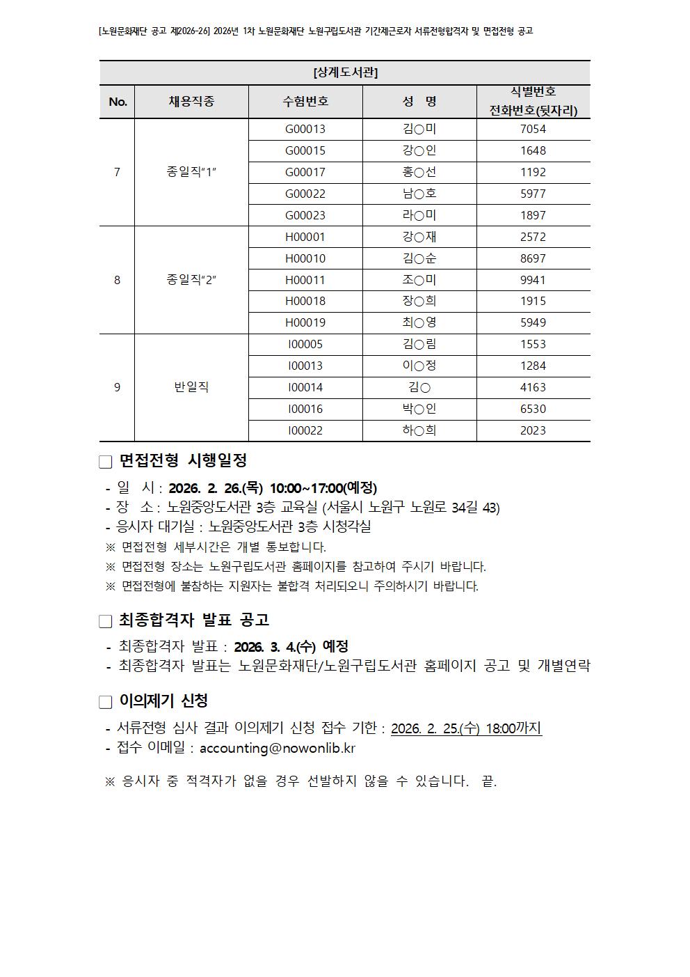 채용공고 2026년 1차 노원문화재단 노원구립도서관 기간제근로자 서류전형합격자 및 면접전형 공고 2026.02.23 147 현재 URL 복사 블로그 바로가기 첨부파일 #1: [붙임] 채용결과이의신청서.hwp 다음글 2026년 제2차 공개채용 최종합격자 공고 목록