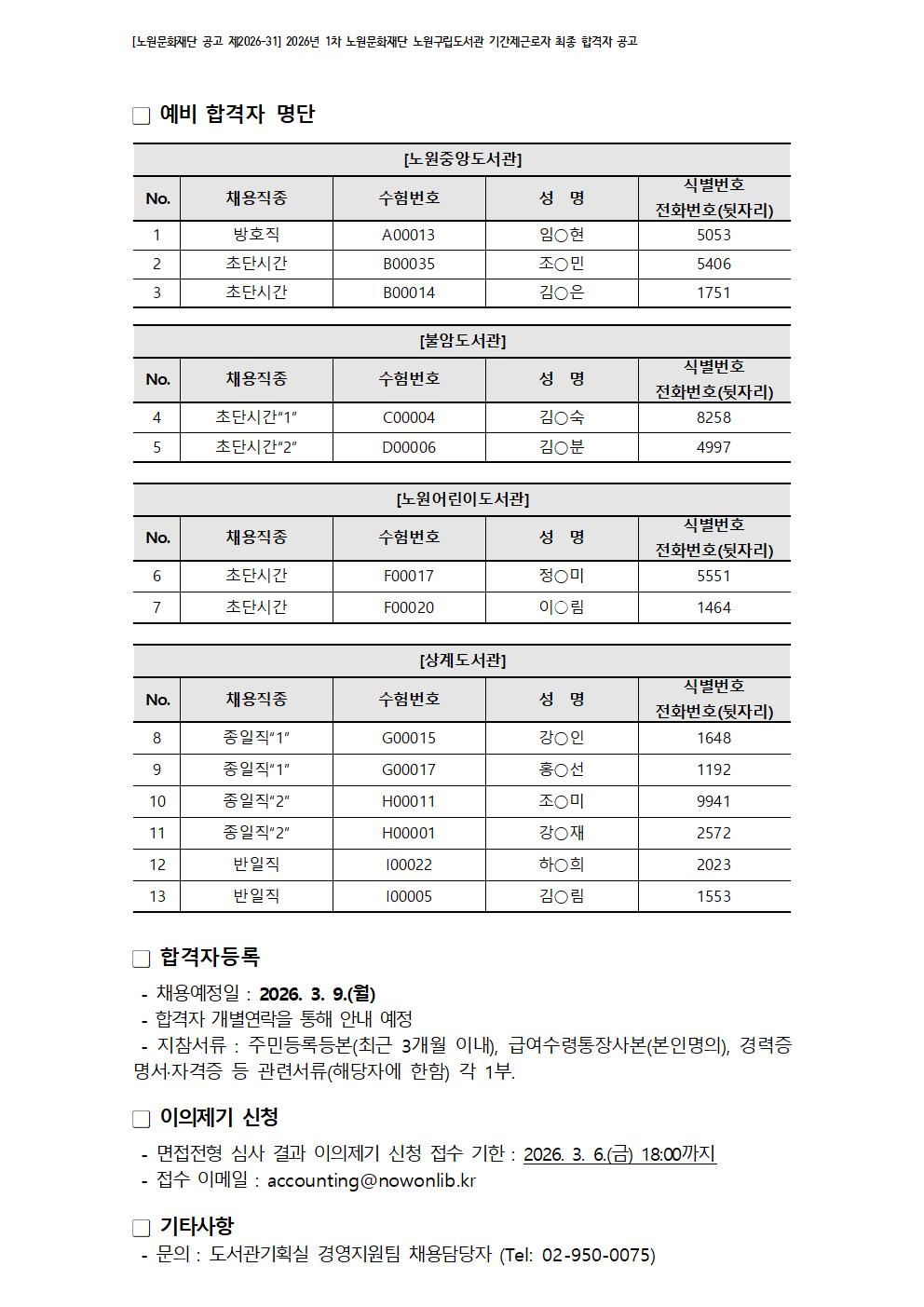 채용공고 2026년 1차 노원문화재단 노원구립도서관 기간제근로자 최종 합격자 공고 2026.03.04 138 현재 URL 복사 블로그 바로가기 첨부파일 #1: [붙임] 채용결과이의신청서.hwp 다음글 2026년 2차 노원문화재단 노원구립도서관 서류전형 합격자 및 면접전형 공고[대체계약직-사서] 목록