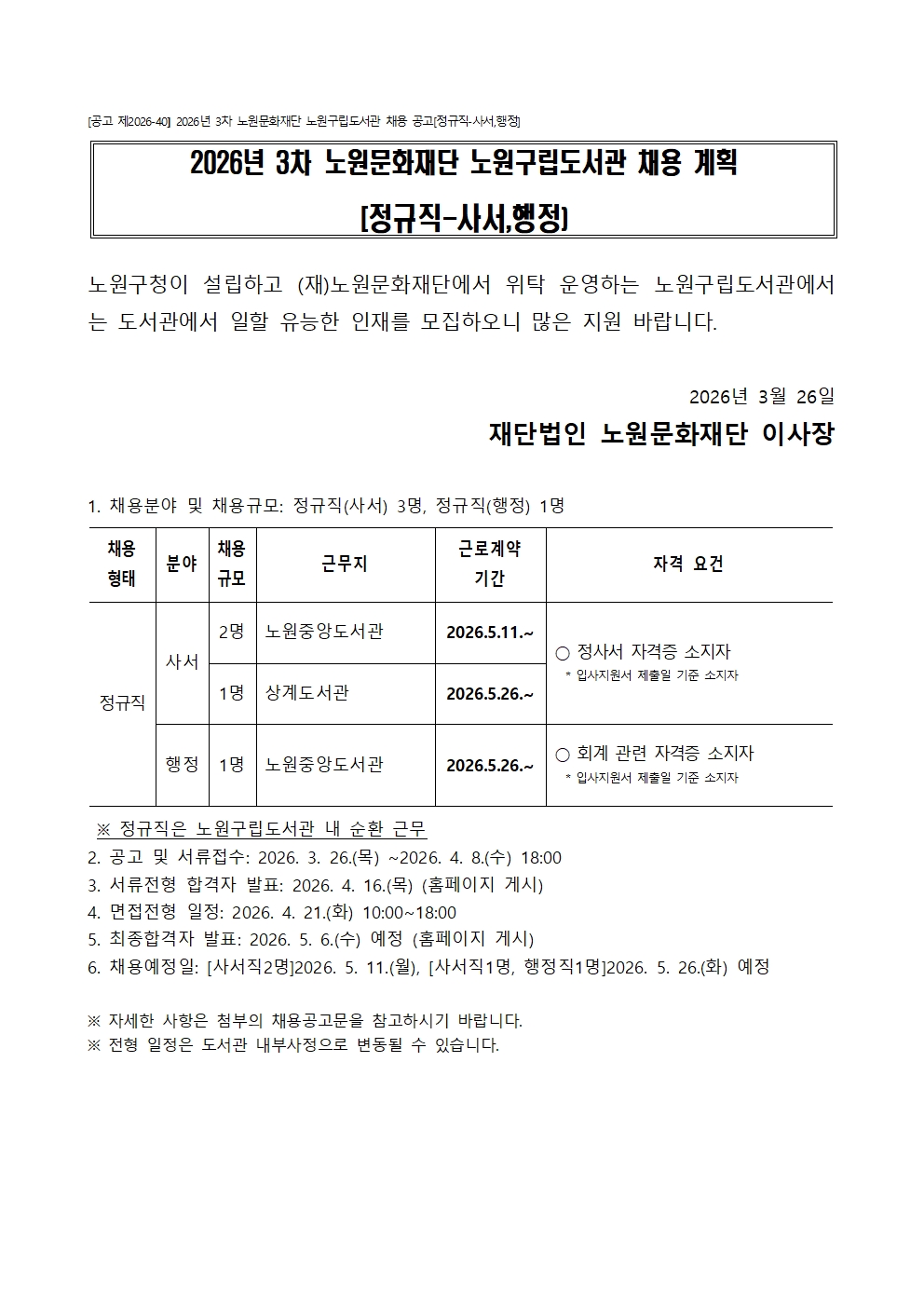 채용공고 2026년 3차 노원문화재단 노원구립도서관 채용 공고[정규직-사서,행정] 2026.03.26 186 현재 URL 복사 블로그 바로가기 ☞온라인 채용 사이트 바로가기 첨부파일 #1: 채용결과 이의신청서.hwp 첨부파일 #2: [공고 제2026-40] 2026년 3차 노원문화재단 노원구립도서관 채용 공고[정규직-사서,행정].pdf 다음글 2026년 제3차 공개채용 공고 목록