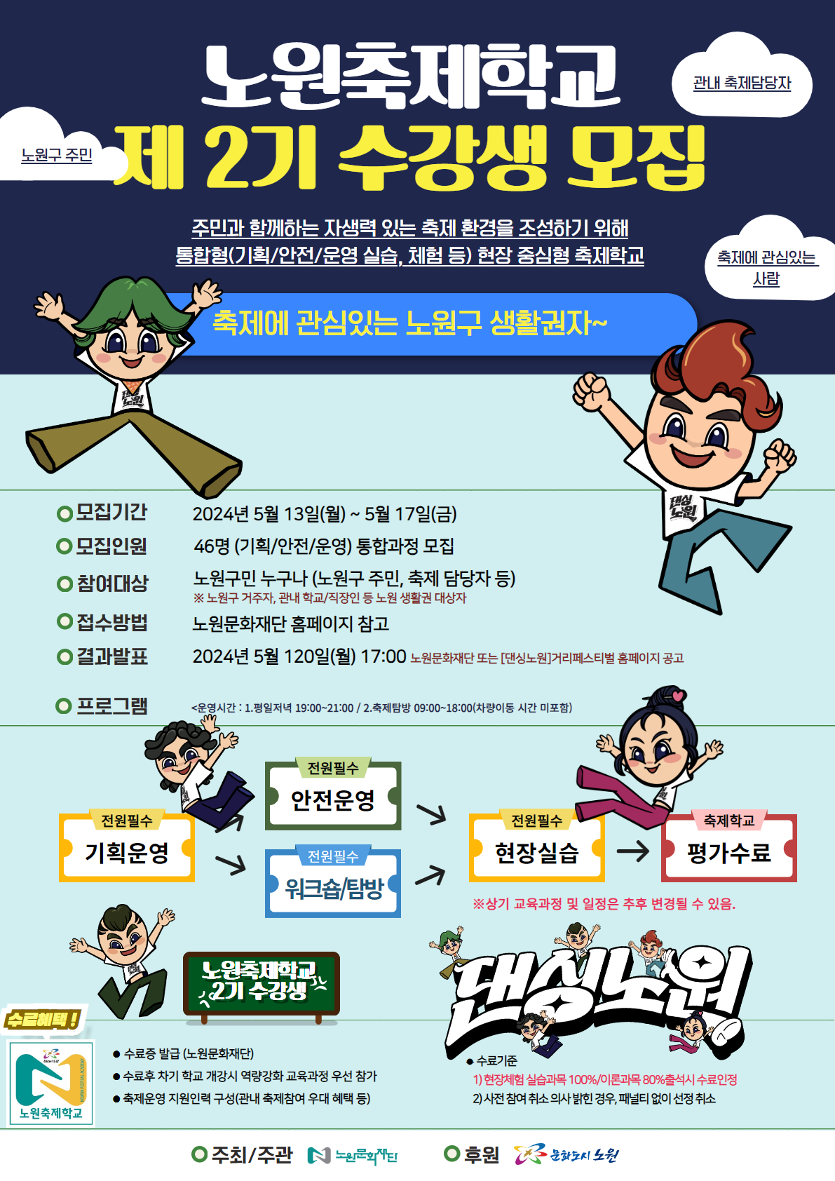 시민참여형 축제로서 2024 [댄싱노원]거리페스티벌 서울시브랜드축제인 노원구 대표축제를 중심으로 구민 참여를 확대하고, 자생력 있는 축제기반 조성과 안전한 축제 운영을 위해 노원구민을 대상으로 축제전문인력을 양성하고자 제 2기 노원축제학교 수강생 모집을 합니다.