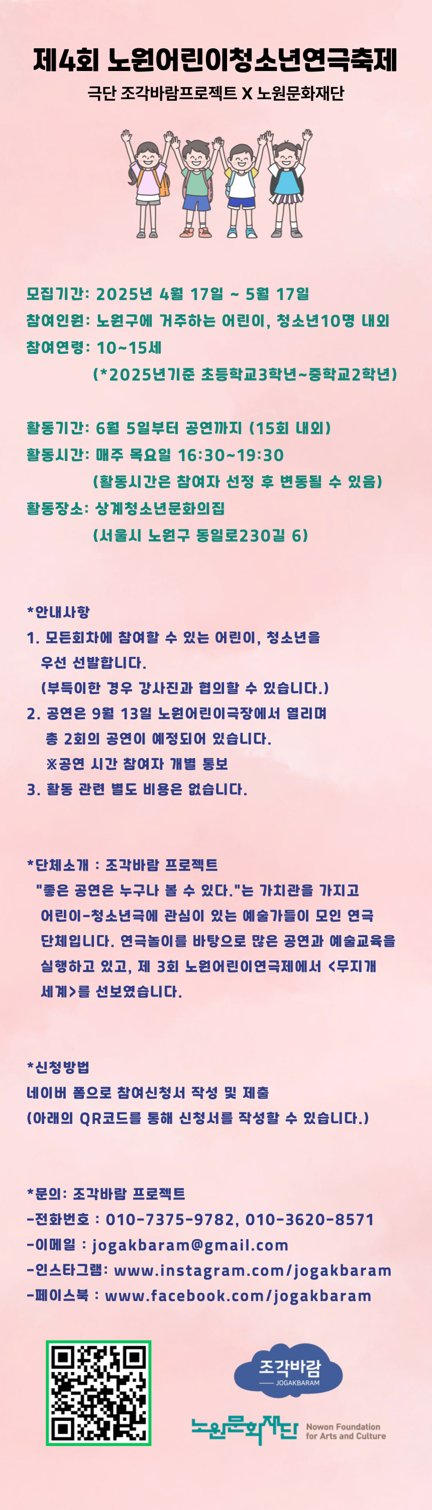 공지사항 제4회 노원 어린이청소년 연극제 참여자 어린이 배우 모집 2025.03.18 21,577 현재 URL 복사 블로그 바로가기 노원맘스 참여자 모집 링크노원연극협회 참여자 모집 링크조각바람프로젝트 참여자 모집 링크 첨부파일 #1: 조각바람프로젝트 모집 공고.jpg 이전글 2025년 노원문화재단 청렴서한문 다음글 2025년 1분기 문화강좌 <연극교실> 수강생 모집 목록