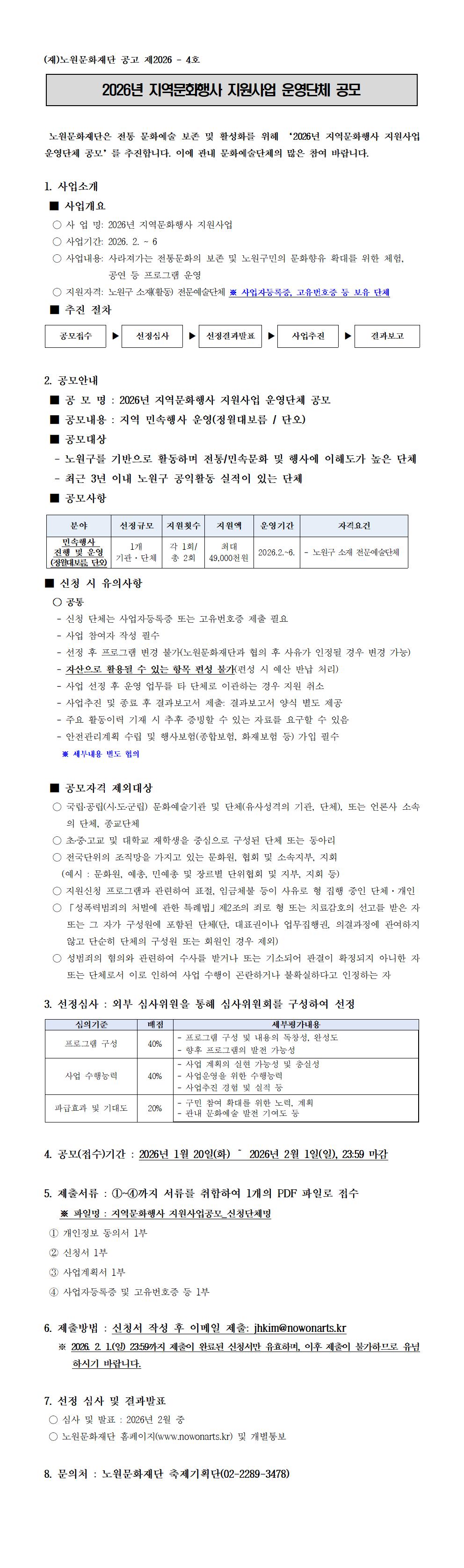 공지사항 2026 지역문화행사 지원사업 공모 2026.01.20 16 현재 URL 복사 블로그 바로가기 첨부파일 #1: 개인정보동의서 및 공모신청서.hwp 다음글 2026 노원구립청춘실버합창단 신규단원 모집 목록