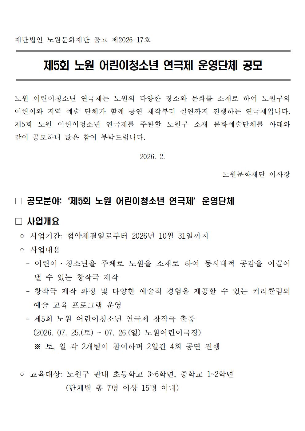 공지사항 2026 제5회 노원 어린이청소년 연극제 운영단체 공모 2026.02.06 17 현재 URL 복사 블로그 바로가기 첨부파일 #1: 2026 제5회 노원 어린이청소년 연극제 운영단체 공모신청서.hwp 다음글 2026 지역문화행사 지원사업 공모 심사 결과 발표 목록