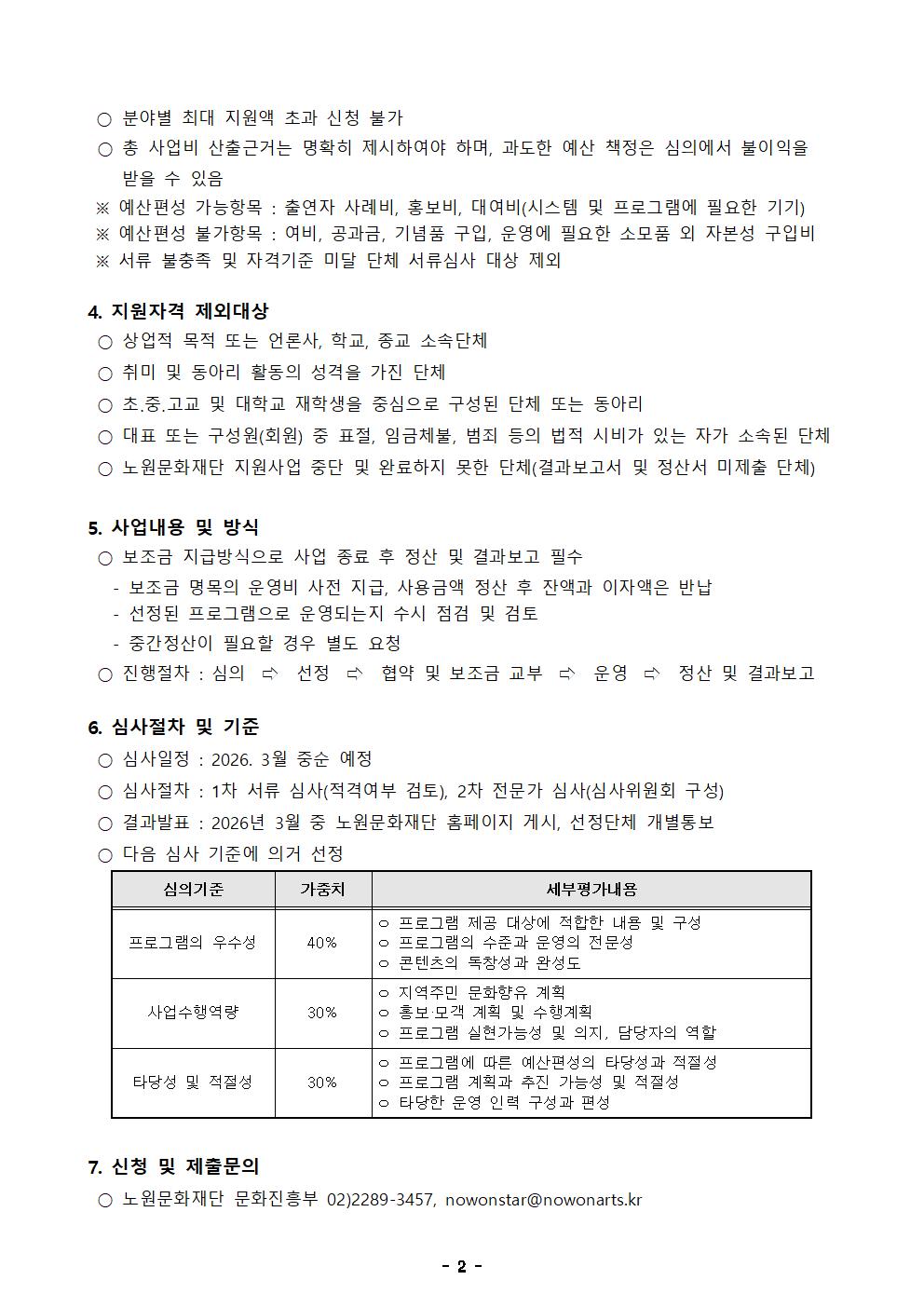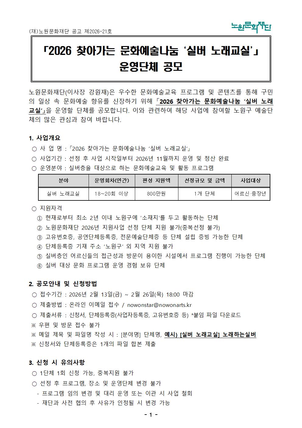 공지사항 「2026 찾아가는 문화예술나눔 '실버 노래교실'」 운영단체 공모 2026.02.12 37 현재 URL 복사 블로그 바로가기 첨부파일 #1: 실버노래교실_지원신청서.hwp 다음글 2026년 1분기 문화강좌 수강생 모집(맑은소리 가곡교실, 연극교실) 목록
