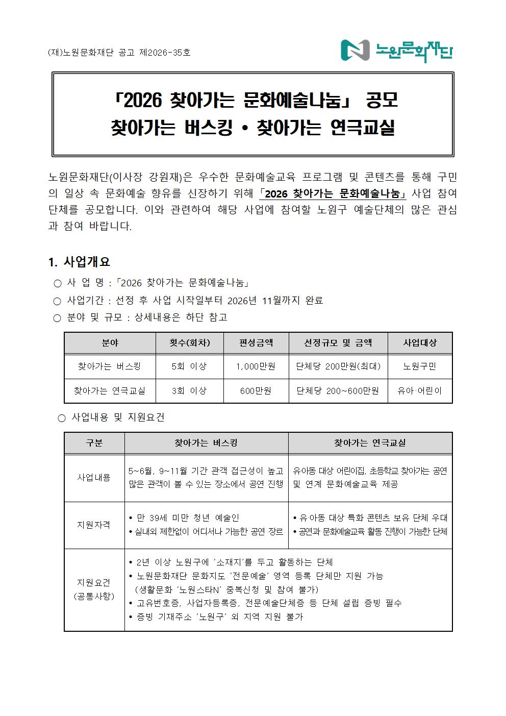 공지사항 「2026 찾아가는 문화예술나눔」'찾아가는 버스킹' '찾아가는 연극교실' 공모 2026.03.16 19 현재 URL 복사 블로그 바로가기 첨부파일 #1: 버스킹_지원신청서.hwp 첨부파일 #2: 연극교실_지원신청서.hwp 다음글 「2026 찾아가는 문화예술나눔 '실버 노래교실'」 운영단체 선정 결과 안내 목록