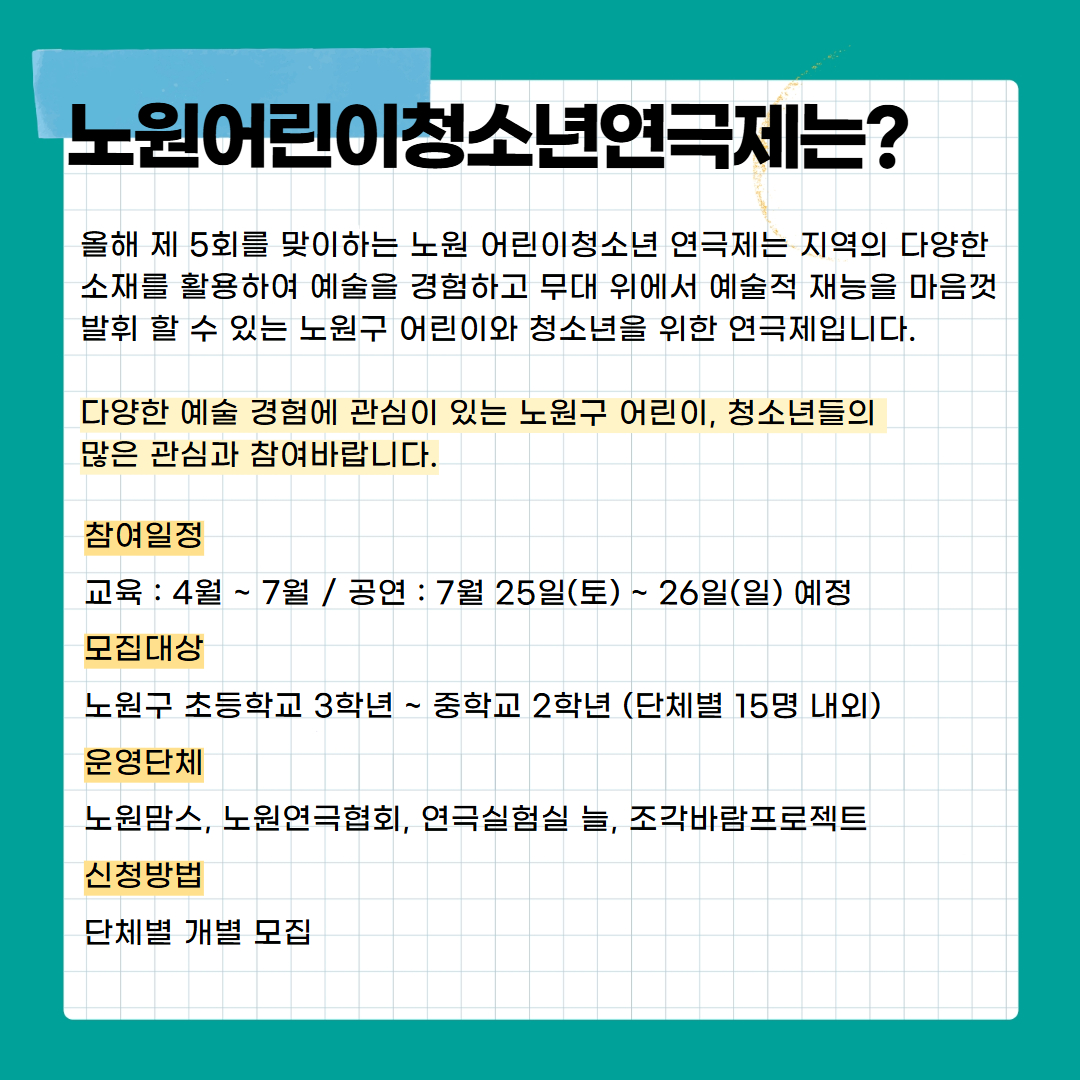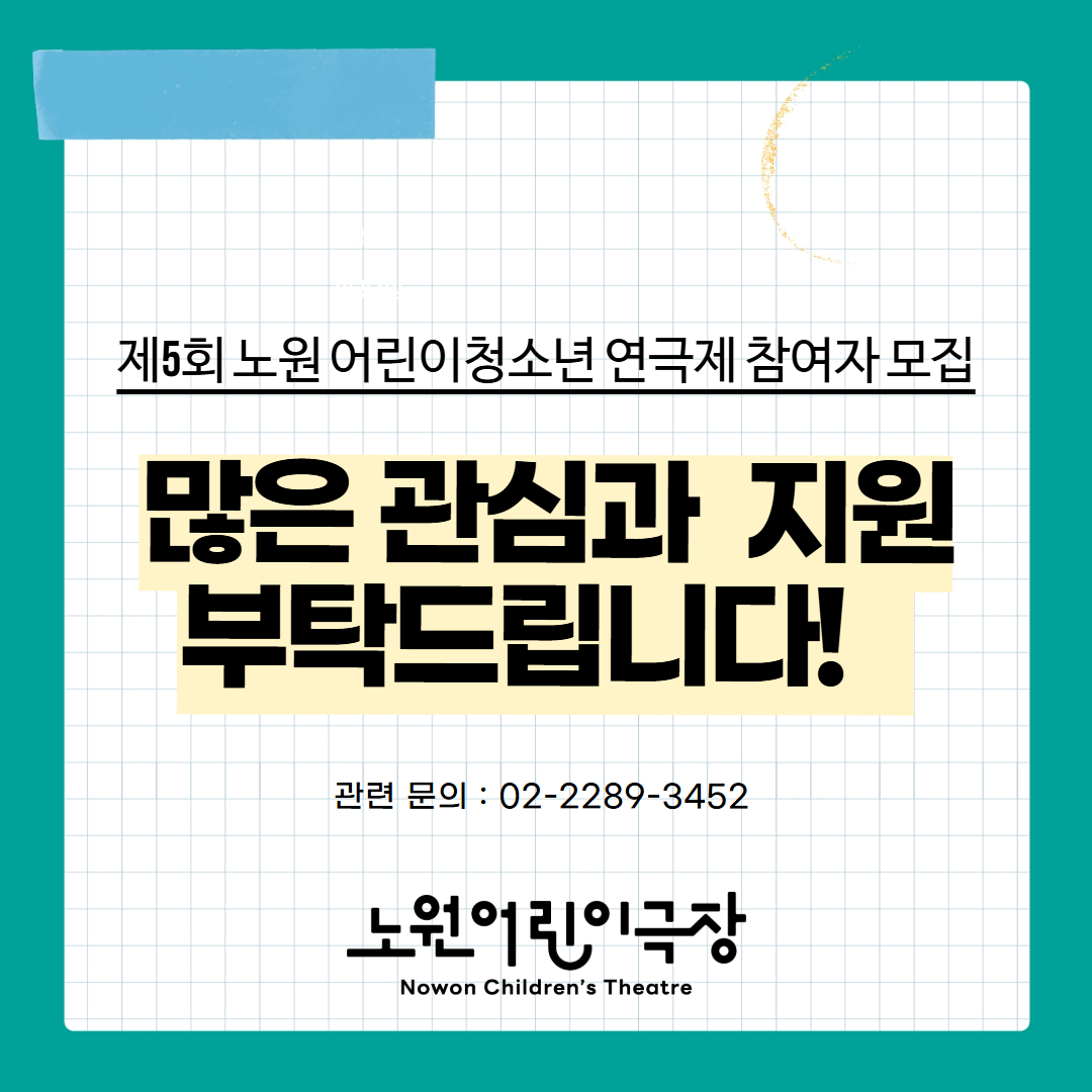 공지사항 2026 제5회 노원 어린이청소년 연극제 참여자 어린이 배우 모집 2026.03.18 46 현재 URL 복사 블로그 바로가기 다음글 「2026 찾아가는 문화예술나눔」'찾아가는 버스킹' '찾아가는 연극교실' 공모 목록