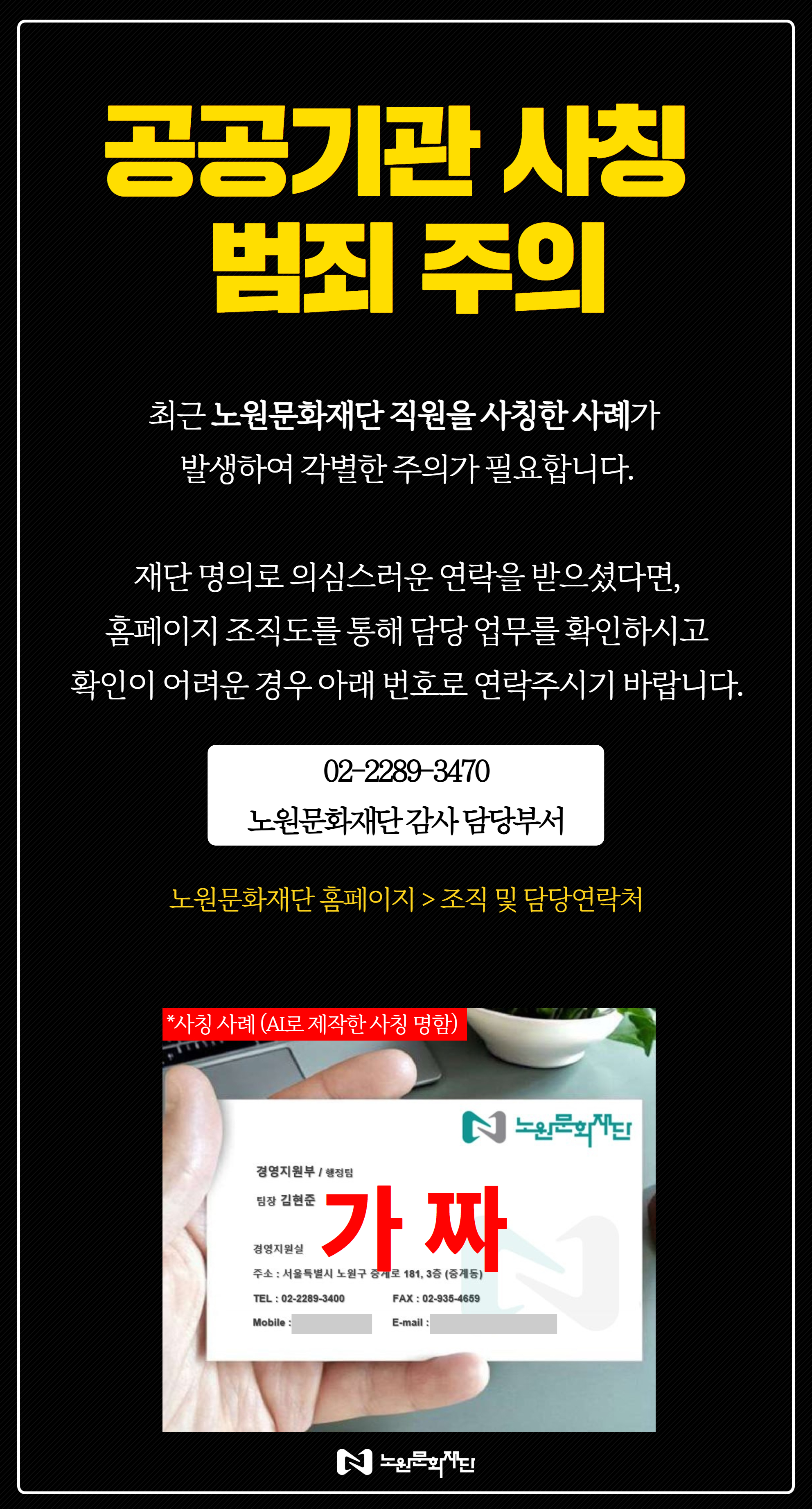 공지사항 공공기관 사칭 범죄 주의 (노원문화재단 직원 사칭 등) 2026.04.08 23 현재 URL 복사 블로그 바로가기 첨부파일 #1: 안내문 (2).jpg 다음글 승용차 5부제(요일제) 시행 안내(2026. 4. 8.(수)부터) 목록