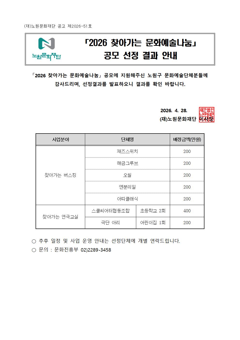 공지사항 「2026 찾아가는 문화예술나눔」공모 선정 결과 안내 2026.04.28 12 현재 URL 복사 블로그 바로가기 첨부파일 #1: 심사총평(첨부).pdf 다음글 2026년 노원문화재단 문화시설 하반기 정기대관 공고 목록