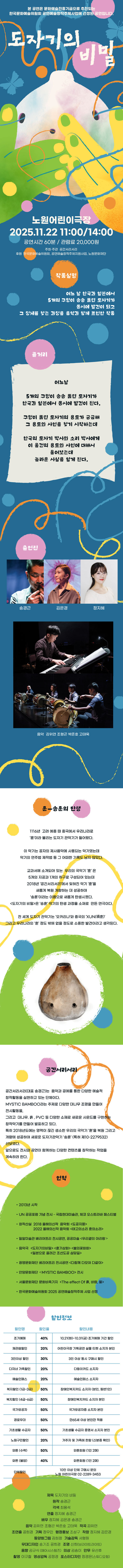 공연 지원사업 예정 창작 음악극 <도자기의 비밀> 공연일시 2025.11.22(토) ~ 2025.11.22(토) 공연시간 60분 장 소 노원어린이극장 티 켓 전석 2만원 장 르 연극 관람연령 36개월 이상 관람가 현재 URL 복사 블로그 바로가기 예매하기 목록 공연정보 티켓예매 및 취소시 유의사항 티켓 오픈 : 10.21.(화) 14시 조기예매(40%) : 10.21.(화) ~ 10.31.(금) 티켓예매 및 취소시 유의사항 다둥이 카드 20%, 국가유공자 및 장애인(1~3급 동반 1인 포함 / 4~6급 본인만), 기초생활수급자(일반-본인만) 50% 할인 할인 증빙자료 미지참시 현장에서 정가에 대한 차액을 현금으로 지불하셔야 티켓수령이 가능합니다. 예매취소는 공연전날 오후 5시까지 가능합니다. 취소는 예매하신 예매채널에서 가능합니다. 취소 마감시간 이후에는 예매취소, 환불 및 변경이 불가합니다. 취소일자에 따라서 취소 수수료가 부과되며 예매일 기준보다 관람일 기준이 우선 적용됩니다. 예매취소조건 안내 테이블로 취소일, 취소수수료에 따라 작성되었습니다. 예매취소조건 취소일 취소수수료 예매 후 7일이내 없음 예매 후 8일~관람일 10일전까지 장당 4,000원(티켓금액의 10% 한도) 관람일 9일전~7일전까지 티켓 금액의 10% 관람일 6일전~3일전까지 티켓 금액의 20% 관람일 2일전~1일전까지 티켓 금액의 30% ※ 티켓이 분실, 훼손된 경우에는 재발권이 불가하오니 티켓 보관에 유의하시기 바랍니다. 목록