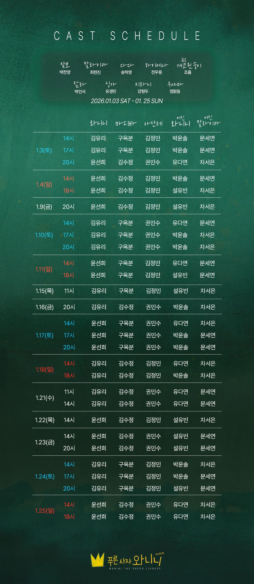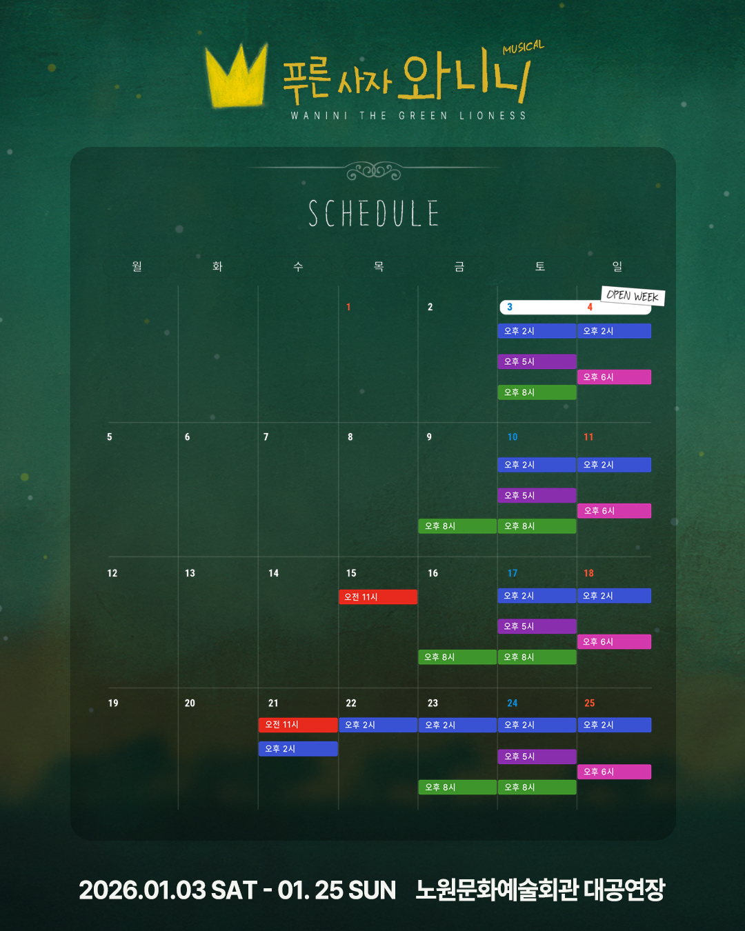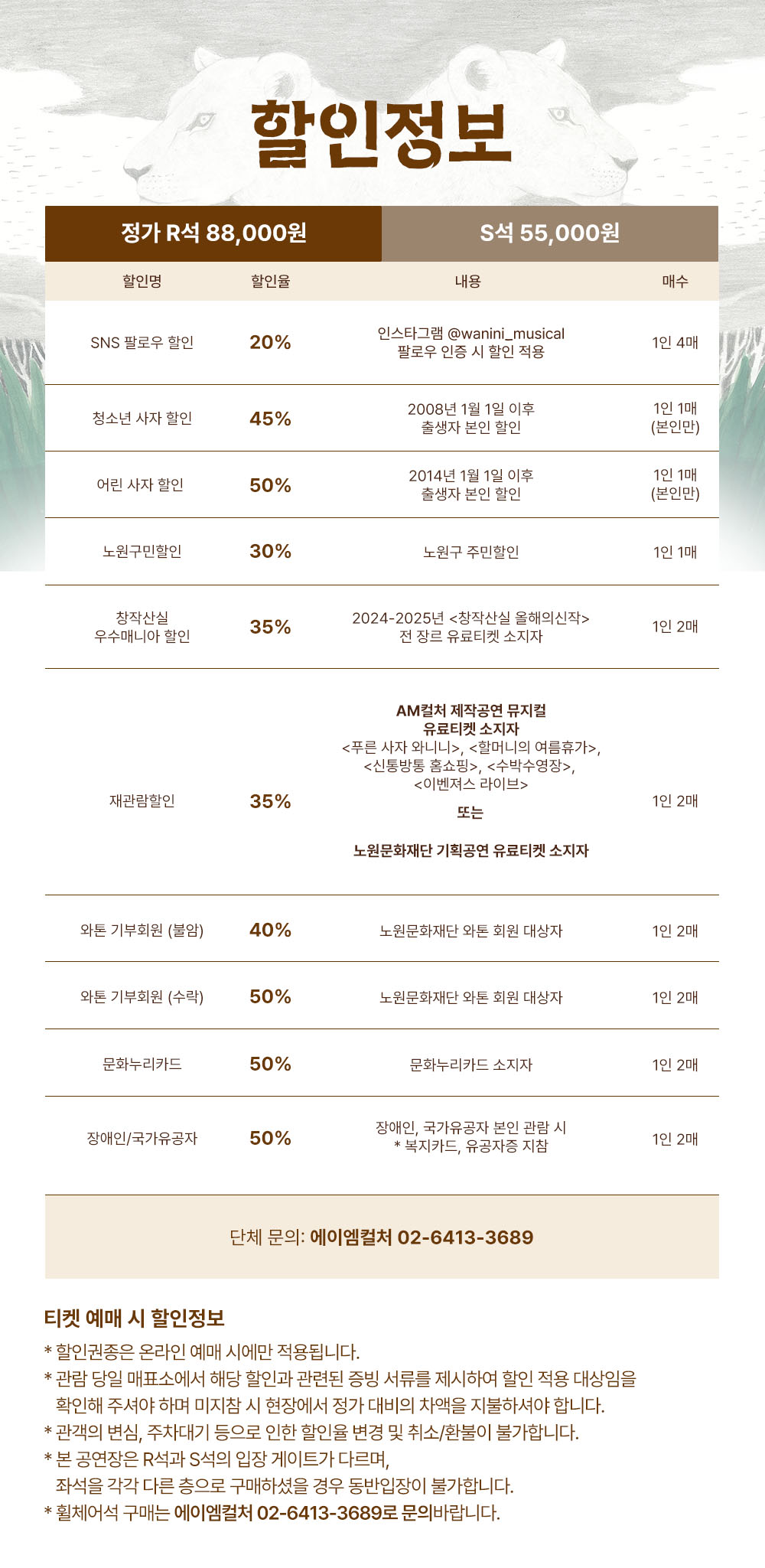 공연 공동기획 종료 2026 공동기획공연 뮤지컬 <푸른사자 와니니> 공연일시 2026.01.03(토) ~ 2026.01.25(일) 공연시간 금 20시 / 토 14시, 17시, 20시 / 일 14시, 18시 장 소 노원문화예술회관 대공연장 티 켓 R석 88,000원 / S석 55,000원 장 르 뮤지컬 관람연령 48개월 이상 현재 URL 복사 블로그 바로가기 예매하기 목록 공연정보 티켓예매 및 취소시 유의사항 할인정보 공지사항 공연정보 티켓예매 및 취소시 유의사항 할인 증빙자료 미지참시 현장에서 정가에 대한 차액을 현금으로 지불하셔야 티켓수령이 가능합니다. 예매취소는 공연전날 오후 5시까지 가능합니다. 취소는 예매하신 예매채널에서 가능합니다. 취소 마감시간 이후에는 예매취소, 환불 및 변경이 불가합니다. 취소일자에 따라서 취소 수수료가 부과되며 예매일 기준보다 관람일 기준이 우선 적용됩니다. 예매취소조건 안내 테이블로 취소일, 취소수수료에 따라 작성되었습니다. 예매취소조건 취소일 취소수수료 예매 후 7일이내 없음 예매 후 8일~관람일 10일전까지 장당 4,000원(티켓금액의 10% 한도) 관람일 9일전~7일전까지 티켓 금액의 10% 관람일 6일전~3일전까지 티켓 금액의 20% 관람일 2일전~1일전까지 티켓 금액의 30% ※ 티켓이 분실, 훼손된 경우에는 재발권이 불가하오니 티켓 보관에 유의하시기 바랍니다. 목록