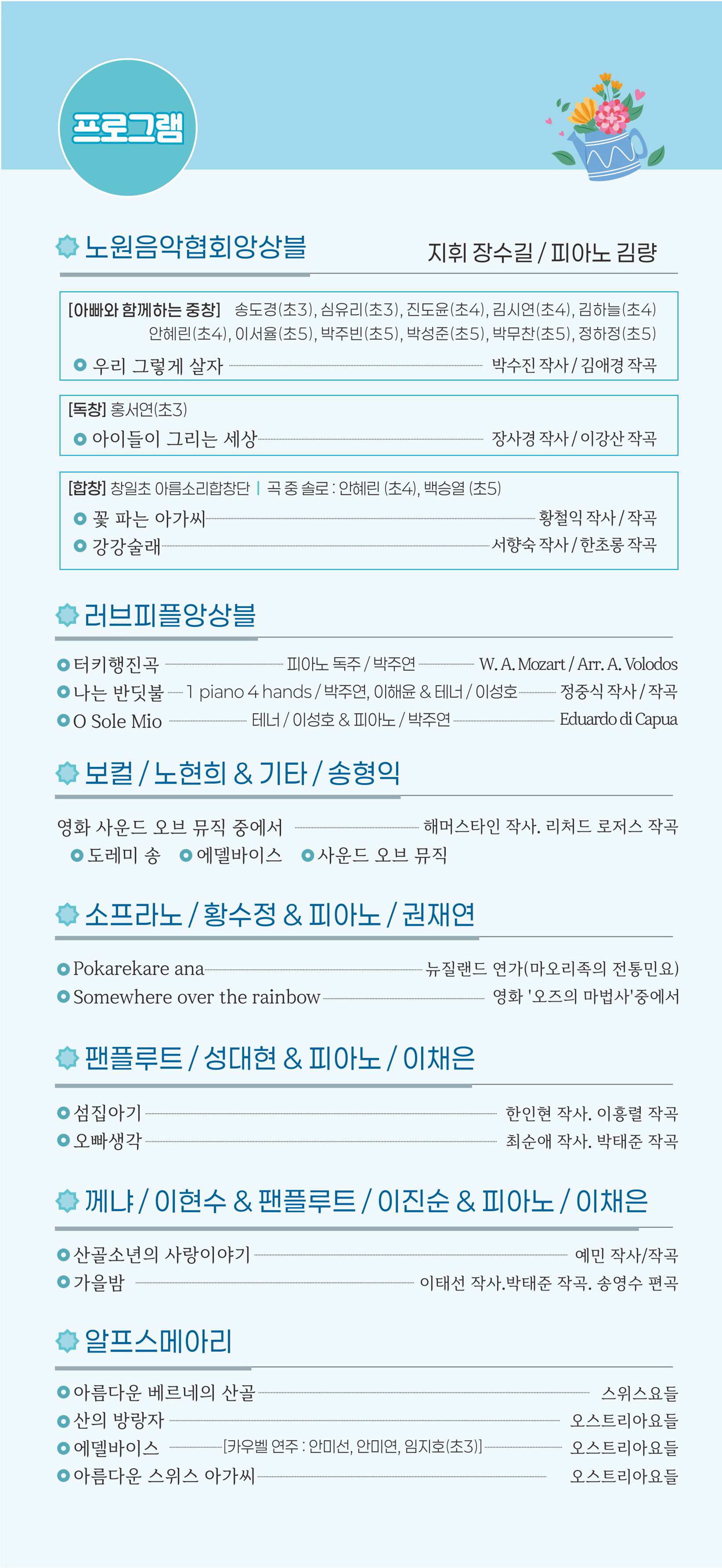 공연 지원사업 예정 2025 노원예술씨앗 지원사업 노원음악협회 <꽃들에게 희망을> 공연일시 2025.11.29(토) ~ 2025.11.29(토) 공연시간 오후 2시 장 소 노원어린이극장 티 켓 전석무료 장 르 음악(동요) 관람연령 36개월 이상 현재 URL 복사 블로그 바로가기 목록 공연정보 티켓예매 및 취소시 유의사항 티켓예매 및 취소시 유의사항 할인 증빙자료 미지참시 현장에서 정가에 대한 차액을 현금으로 지불하셔야 티켓수령이 가능합니다. 예매취소는 공연전날 오후 5시까지 가능합니다. 취소는 예매하신 예매채널에서 가능합니다. 취소 마감시간 이후에는 예매취소, 환불 및 변경이 불가합니다. 취소일자에 따라서 취소 수수료가 부과되며 예매일 기준보다 관람일 기준이 우선 적용됩니다. 예매취소조건 안내 테이블로 취소일, 취소수수료에 따라 작성되었습니다. 예매취소조건 취소일 취소수수료 예매 후 7일이내 없음 예매 후 8일~관람일 10일전까지 장당 4,000원(티켓금액의 10% 한도) 관람일 9일전~7일전까지 티켓 금액의 10% 관람일 6일전~3일전까지 티켓 금액의 20% 관람일 2일전~1일전까지 티켓 금액의 30% ※ 티켓이 분실, 훼손된 경우에는 재발권이 불가하오니 티켓 보관에 유의하시기 바랍니다. 목록