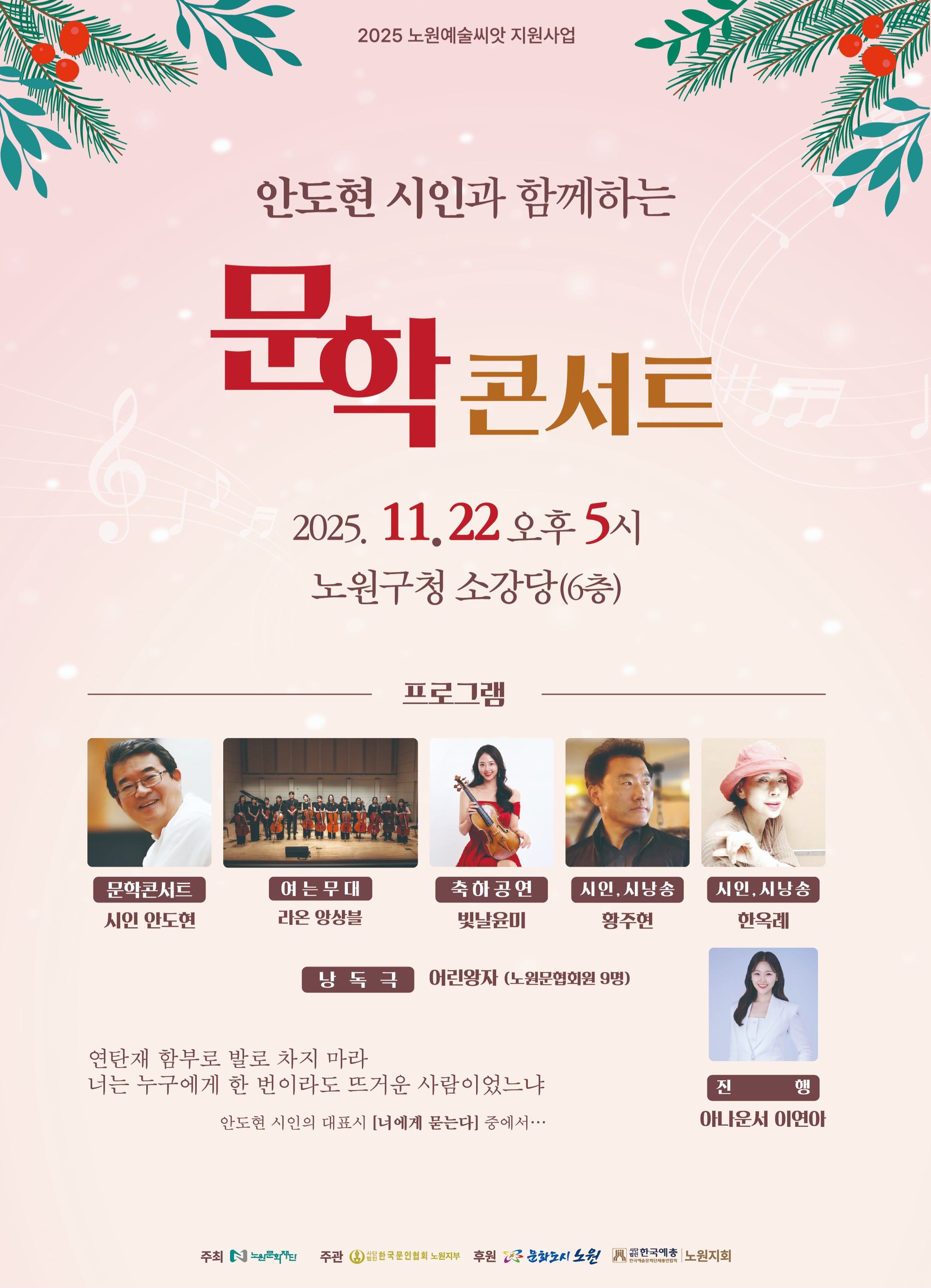 공연 지원사업 예정 2025 노원예술씨앗 지원사업 노원문인협회 < 안도현 시인과 함께하는 문학콘서트> 공연일시 2025.11.22(토) ~ 2025.11.22(토) 공연시간 17시 장 소 노원구청 6층 소강당 티 켓 전석무료 장 르 시낭송 등 관람연령 전체연령 관람 가능 현재 URL 복사 블로그 바로가기 목록 공연정보 티켓예매 및 취소시 유의사항 문의사항 : 02-2289-3451 티켓예매 및 취소시 유의사항 할인 증빙자료 미지참시 현장에서 정가에 대한 차액을 현금으로 지불하셔야 티켓수령이 가능합니다. 예매취소는 공연전날 오후 5시까지 가능합니다. 취소는 예매하신 예매채널에서 가능합니다. 취소 마감시간 이후에는 예매취소, 환불 및 변경이 불가합니다. 취소일자에 따라서 취소 수수료가 부과되며 예매일 기준보다 관람일 기준이 우선 적용됩니다. 예매취소조건 안내 테이블로 취소일, 취소수수료에 따라 작성되었습니다. 예매취소조건 취소일 취소수수료 예매 후 7일이내 없음 예매 후 8일~관람일 10일전까지 장당 4,000원(티켓금액의 10% 한도) 관람일 9일전~7일전까지 티켓 금액의 10% 관람일 6일전~3일전까지 티켓 금액의 20% 관람일 2일전~1일전까지 티켓 금액의 30% ※ 티켓이 분실, 훼손된 경우에는 재발권이 불가하오니 티켓 보관에 유의하시기 바랍니다. 목록