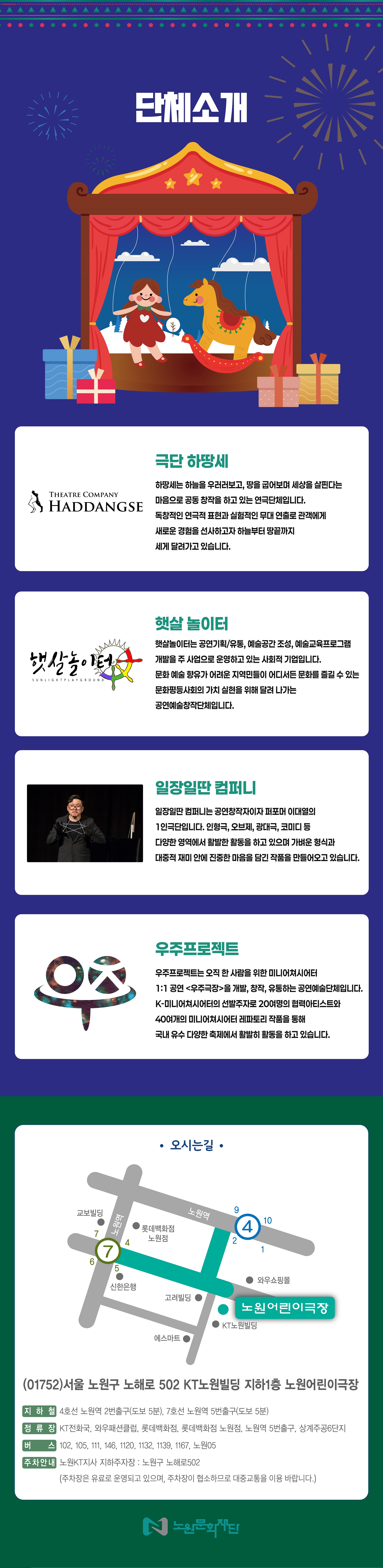 공연 기획공연 종료 2025 노원어린이극장 축제프로그램 <와따가따 가족극장> 공연일시 2025.12.13(토) ~ 2025.12.13(토) 공연시간 극장공연 : 11시, 14시 30분 / 로비프로그램 : 10시~17시 장 소 노원어린이극장 티 켓 전석 2만원 장 르 오브제 공연 및 체험 관람연령 36개월 이상 현재 URL 복사 블로그 바로가기 예매하기 목록 공연정보 티켓예매 및 취소시 유의사항 | 티켓 오픈 11. 20.(목) 14시 | | 조기예매 40% 할인 11. 20.(목) ~ 11. 27.(목) | 티켓예매 및 취소시 유의사항 할인 증빙자료 미지참시 현장에서 정가에 대한 차액을 현금으로 지불하셔야 티켓수령이 가능합니다. 예매취소는 공연전날 오후 5시까지 가능합니다. 취소는 예매하신 예매채널에서 가능합니다. 취소 마감시간 이후에는 예매취소, 환불 및 변경이 불가합니다. 취소일자에 따라서 취소 수수료가 부과되며 예매일 기준보다 관람일 기준이 우선 적용됩니다. 예매취소조건 안내 테이블로 취소일, 취소수수료에 따라 작성되었습니다. 예매취소조건 취소일 취소수수료 예매 후 7일이내 없음 예매 후 8일~관람일 10일전까지 장당 4,000원(티켓금액의 10% 한도) 관람일 9일전~7일전까지 티켓 금액의 10% 관람일 6일전~3일전까지 티켓 금액의 20% 관람일 2일전~1일전까지 티켓 금액의 30% ※ 티켓이 분실, 훼손된 경우에는 재발권이 불가하오니 티켓 보관에 유의하시기 바랍니다. 목록