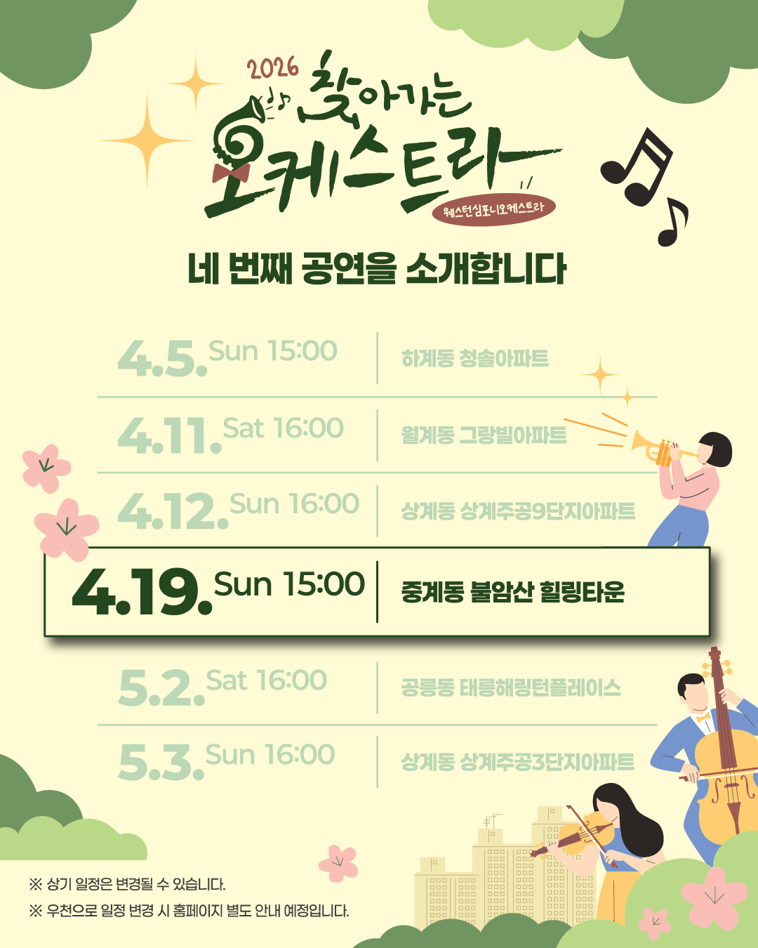 공연 기획공연 예정 2026 찾아가는 오케스트라|4월 19일 15시 불암산 힐링타운 공연일시 2026.04.19(일) ~ 2026.04.19(일) 공연시간 15:00 장 소 중계동 불암산 힐링타운(불암산 철쭉제) 티 켓 - 장 르 클래식, 대중음악 관람연령 노원구민 누구나 관람 가능 / 사전신청 없음 현재 URL 복사 블로그 바로가기 목록 공연정보 티켓예매 및 취소시 유의사항 <2026 찾아가는 오케스트라> 4월 19일 공연은 <2026년 불암산 철쭉제>와 함께 합니다!🌸🎵👉 2026년 불암산 철쭉제 홈페이지 바로가기 티켓예매 및 취소시 유의사항 할인 증빙자료 미지참시 현장에서 정가에 대한 차액을 현금으로 지불하셔야 티켓수령이 가능합니다. 예매취소는 공연전날 오후 5시까지 가능합니다. 취소는 예매하신 예매채널에서 가능합니다. 취소 마감시간 이후에는 예매취소, 환불 및 변경이 불가합니다. 취소일자에 따라서 취소 수수료가 부과되며 예매일 기준보다 관람일 기준이 우선 적용됩니다. 예매취소조건 안내 테이블로 취소일, 취소수수료에 따라 작성되었습니다. 예매취소조건 취소일 취소수수료 예매 후 7일이내 없음 예매 후 8일~관람일 10일전까지 장당 4,000원(티켓금액의 10% 한도) 관람일 9일전~7일전까지 티켓 금액의 10% 관람일 6일전~3일전까지 티켓 금액의 20% 관람일 2일전~1일전까지 티켓 금액의 30% ※ 티켓이 분실, 훼손된 경우에는 재발권이 불가하오니 티켓 보관에 유의하시기 바랍니다. 목록